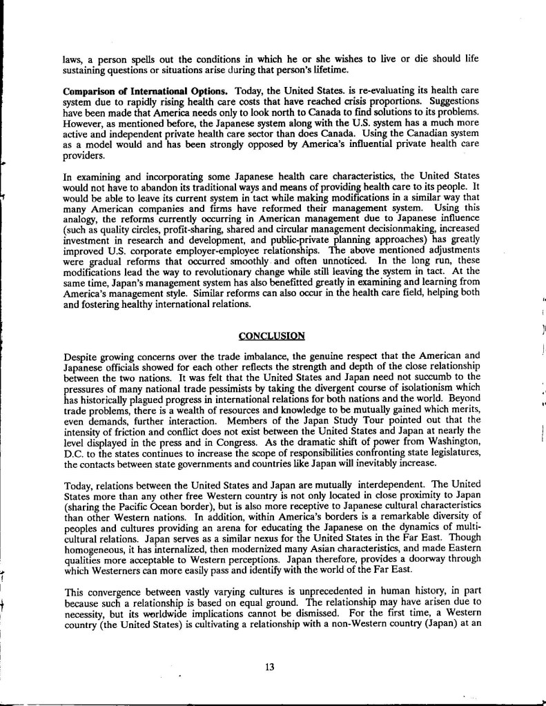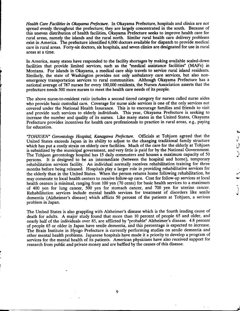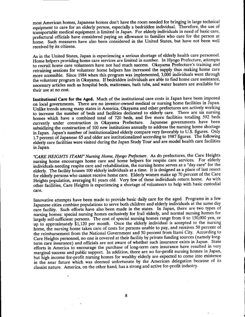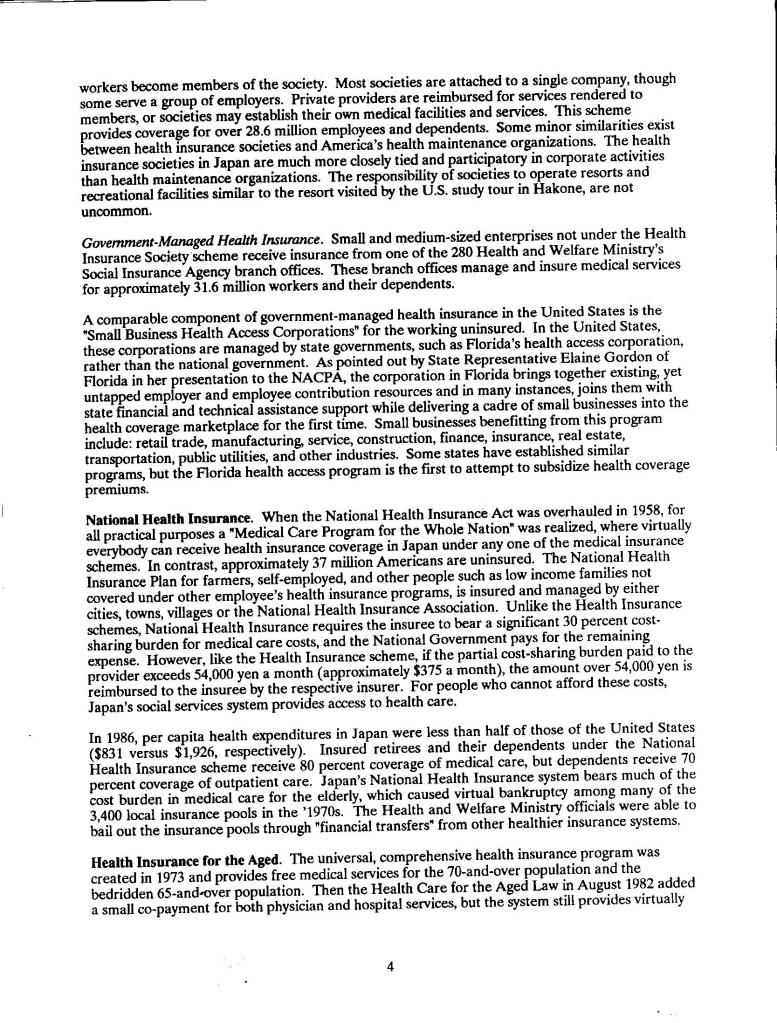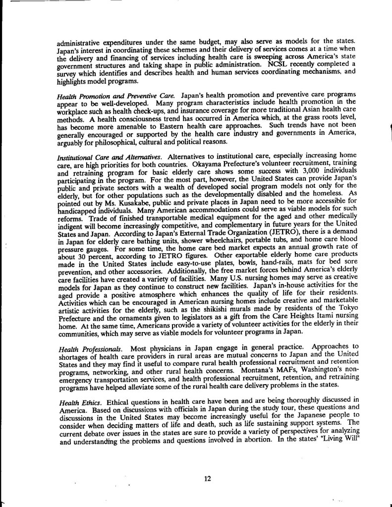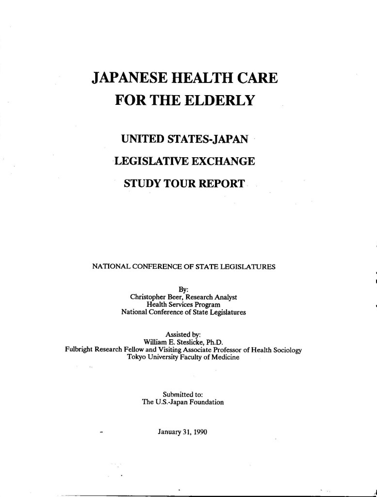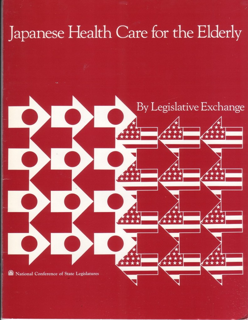 Though published so along ago, I was cleaning out the basement storage the other day, and came upon my only printed copy of US-Japan Foundation/NCSL – Japanese Health Care for Elderly which was published by US-Japan Foundation and National Conference of State Legislatures (1990). I couldn’t find it anywhere. It has been referenced on a number of library websites, but no copy. I realized my co-author Dr. Bill Steslicke and I may have the only copies, along with a few die hard former legislators around the country, so here is a Word doc version. Noteworthy- 1) certain Japanese companies may form their own in-house HMO-style coverage and provisioning. 2) Japanese insurance covers eastern medicine, including but not limited to herbal remedies and acupuncture.